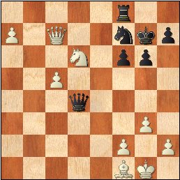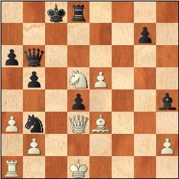Черные уже приготовились принимать сдачу соперника — висит мат и на всякий случай еще и белый слон под боем. Но тут последовало ошеломляющее 32.Bh7!! И вдруг как-то выяснилось, что мата нет, а все черные фигуры подвисли в воздухе. 32 Rf8? Еще позволяло держать удар скромное 32 Rh6 33.Ng4 R8:h7 — и вся борьба еще впереди. Сейчас же после 33.Qg3 позиция черных рассыпается. 1-0.