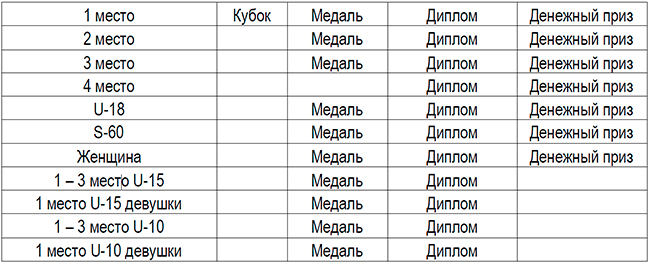 Участники, занявшие 1 - 3 место, лучшая женщина, лучший юниор до 18 лет и ветеран 60+ награждаются медалями, дипломами и денежным призом (фонд образуется из турнирных взносов).