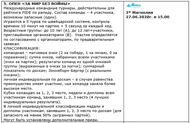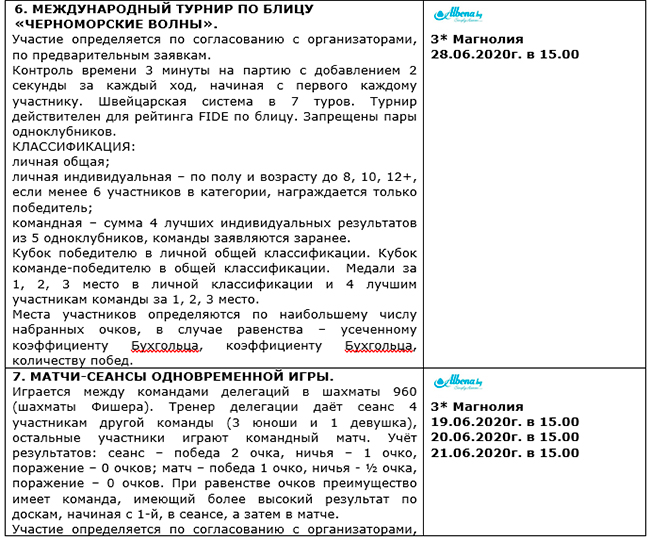 На всемирно известном черноморском курорте Албена, Республика Болгария, на территории области Добрич с 17 июня 2020г. – день приезда, по 1 июля 2020г. – день отъезда, организуется МЕЖДУНАРОДНЫЙ ШАХМАТНЫЙ ФЕСТИВАЛЬ «ИНТЕЛЛЕКТЫ МИРА».