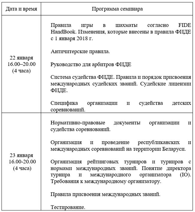 22 и 23 января 2020 года, в рамках международного шахматного турнира «Орша-2020», пройдет Республиканский семинар судей Белорусской федерации шахмат. Главный лектор семинара – Эльберг Вячеслав Максимович (IA).