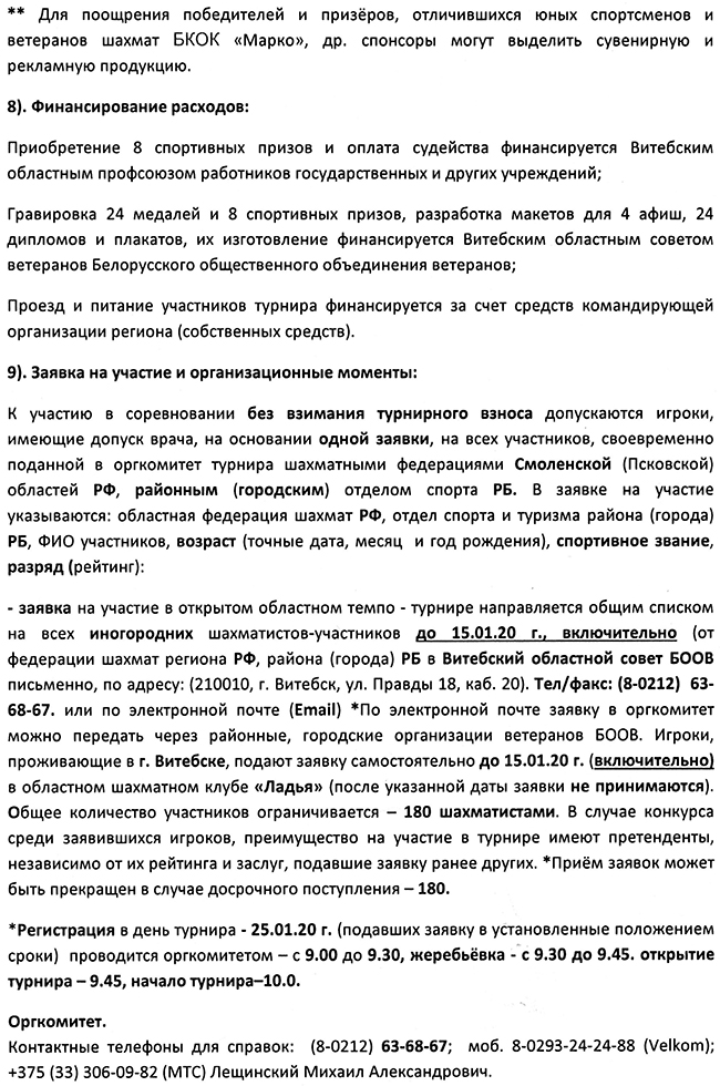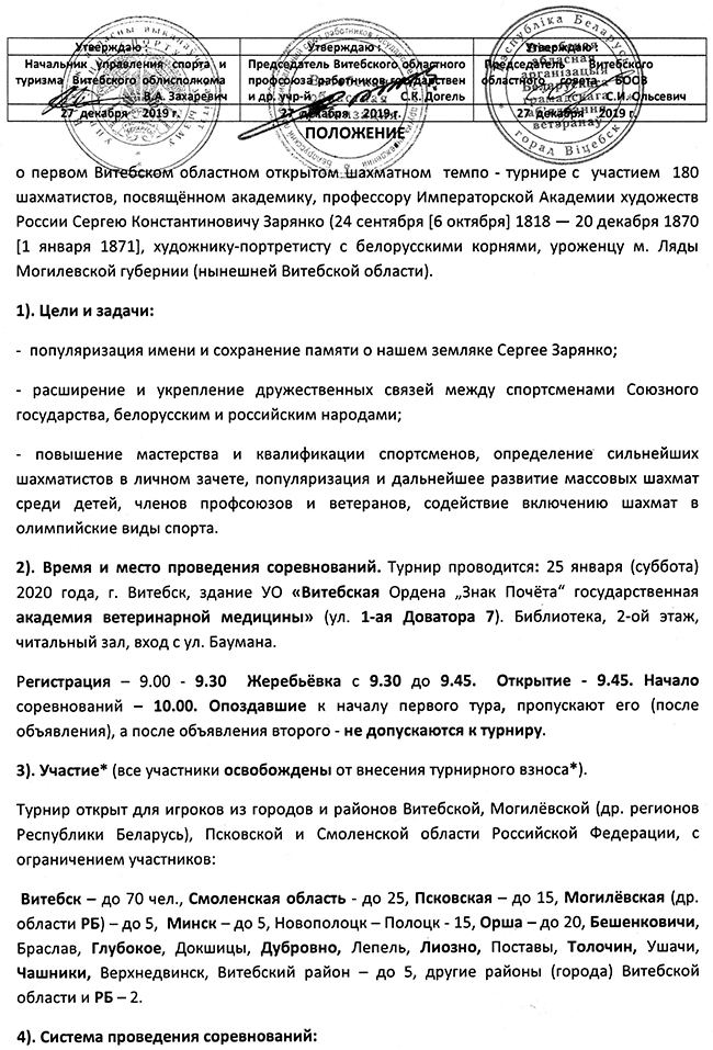 25 января в здании УО "Витебская Ордена "Знак Почета" государственная академия ветеринарной медицины (ул. 1-ая Доватора, 7) пройдет первый областной открытый шахматный темпо-турнир посвященный академику, художнику-портретисту с белорусскими корнями, уроженцу м.Ляды Сергею Константиновичу Зарянко.