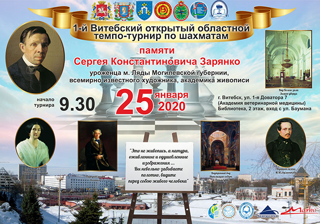 25 января состоялся очередной, 36-ой Витебский областной открытый шахматный темпо-турнир. Его организовали Витебский областной совет ветеранов (БООВ) совместно с нашими партнерами: Витебской академией ветеринарной медицины, управлением спорта и туризма облисполкома, профсоюзом государственных и других учреждений, холдингом БКОК "Марко". На этот раз состоялся первый турнир, посвященный всемирно-известному, но, почти неизвестному у нас в Беларуси художнику-портретисту с белорусскими корнями, уроженцу м. Ляды Могилевской губернии Зарянко Сергею Константиновичу (1818 - 1870), академику, профессору Императорской Академии художеств Российской империи.