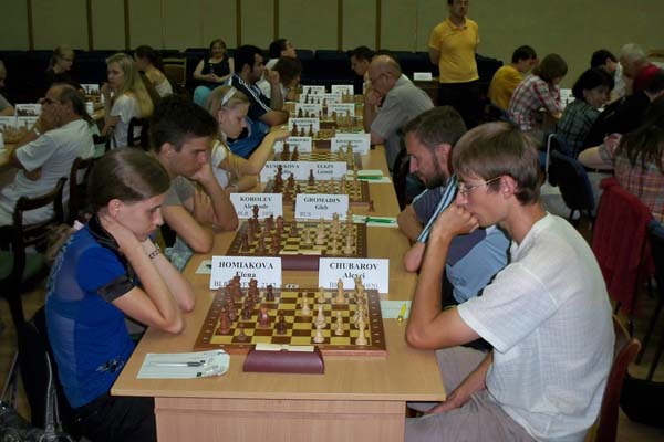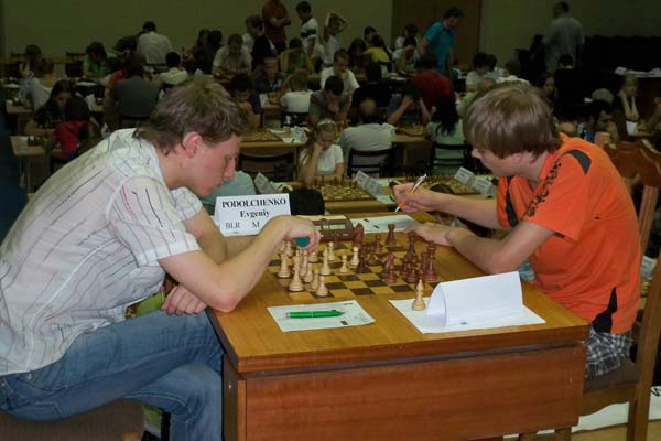 Еще не успела начаться фотосессия наших корреспондентов, а земляки из Санкт-Петербурга лидеры турнира игравшие за первой доской Александр Халифман и Даниил Линчевский уже "расписали" ничейку и ловко улизнули от фотовспышек. Остальные события тура в традиционном фотоотчете.
