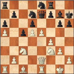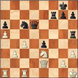 20.e6! Ndf6 21.f5! Красочная позиция! Пешки белых идут "свиньей". 21 g5 22.Ra4?! Стоило посчитать несложное 22.Bxg5! hxg5 23.Nxg5+ Kh8 24.exf7! Qxe2 25.Rxe2 Nc7 26.Ra4! Bh6 27.Rh4 Kg7 28.Ne6+ Nxe6 29.fxe6. Лавина белых пешек сметет на своем пути все. 22 Kg8 23.h4 g4 24.Nh2 Nc7? Зачем-то черные отдают пешку g4. Стоило предпочесть 24 h5 25.Bg5 fxe6 26.dxe6 Nc7 27.Rd1 Rad8, но и здесь после 28.Qc2! d5 29.Ne2! конь белых идет на f4 и черным не позавидуешь. 25.Nxg4 fxe6 26.dxe6 Nxg4 27.Qxg4 Qf6 28.Rf1 Kh8 29.Ne4 Qe5 30.Qg6 d5 31.f6 Rxf6 32.Nxf6 1-0.