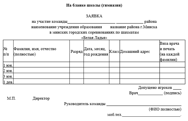 Копии заявки, заверенной таблицы предварительных отборочных соревнований подаются по электронной почте на адрес minskchess@outlook.com до 16 апреля 2020г.