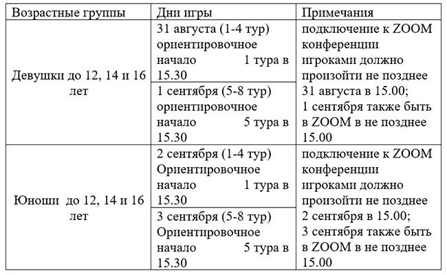 Турнир проводится с 31 августа по 3 сентября 2020 г. в 8 туров по швейцарской системе по следующему графику: