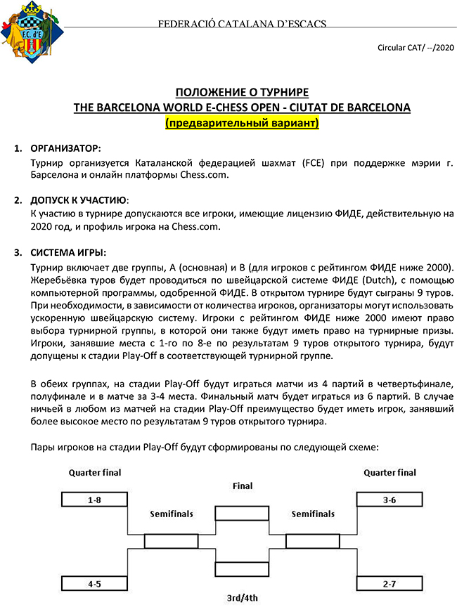 С 28 ноября по 8 декабря на шахматной платформе Chess.com под эгидой Каталонской федерацией шахмат пройдет открытый онлайн турнир the Barcelona world E-chess open – Ciutat de Barcelona.