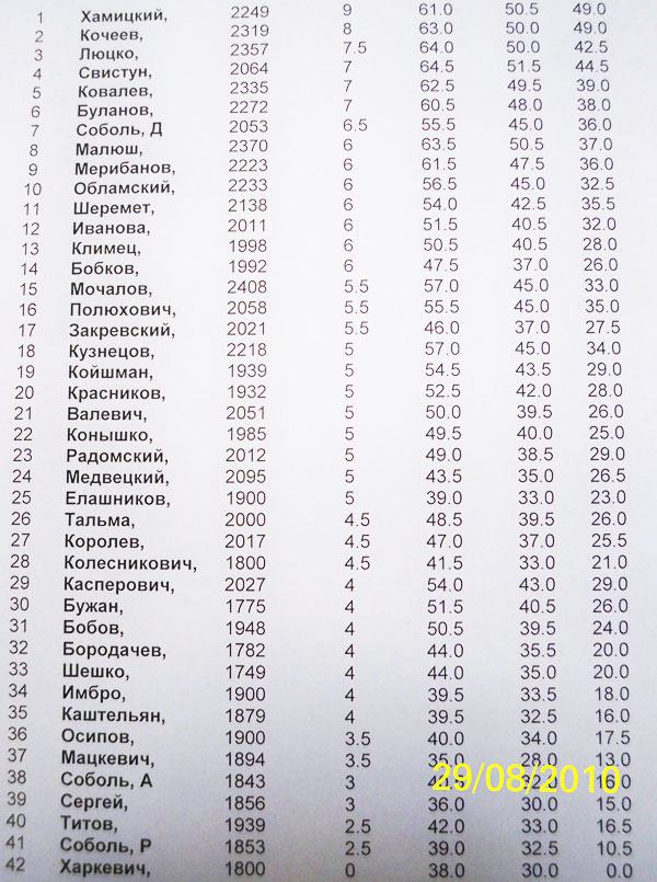 29 августа прошел восьмой, последний летний этап Открытого кубка Минска по блицу с гандикапом.Холодный, уже совсем осенний дождь не смог разрушить планы настоящих любителей блица. 42 участника вышли на старт.
