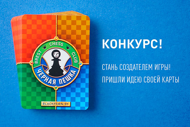 «Внимание, друзья! Объявляем конкурс! Все вы знаете нашу карточную игру для шахматистов "Черная пешка. Сказочный мир". Придумайте название карты и ее действие, пришлите на blackpawnby@gmail.com и ждите волшебную новогоднюю ночь! 1 января 2021 мы объявим победителей, чьи карты будут напечатаны в новой колоде! Стань создателем игры! Присылай свою карту!»