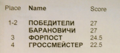В командном зачёте сильнейшей стала команда "Победители" (СДЮШОР№11, тренеры Бондарь Т. В. , Арчакова Г. А. ) — Дмитрий Бичун, Илья Сахар, Никита Рудникевич, Константин Керножицкий, Таисия Бояринцева, серебро у ДЮСШ№1 г.Барановичи (тренер Круликовский Ю. В. ) — Максим Козин, Станислав Бокун,Александр Сухоруков, Ростислав Анисимов, Вячеслав Мухин, бронза досталась команде "Форпост" (СДЮШОР№11, тренеры Рабчёнок Г. Г. , Рабчёнок Е. П. ).