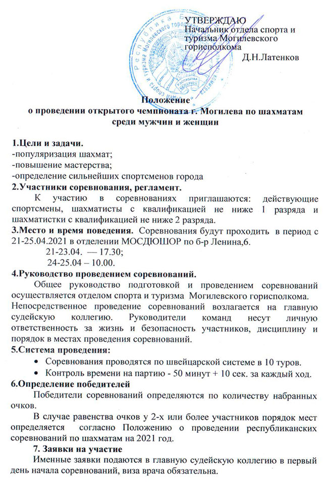 С 21 по 25 апреля пройдет открытый чемпионат города Могилева по шахматам среди мужчин и женщин. Победители будут награждены дипломами, медалями и денежными призами Могилевской областной организации ОО БФШ.