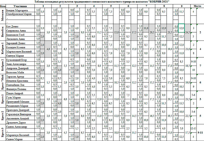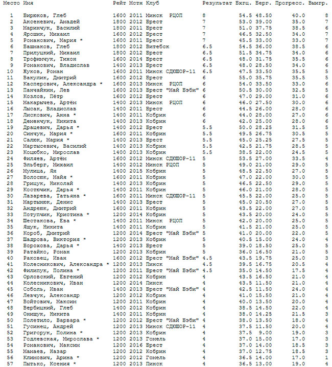 Место Имя Мстн Результат Бхгц. Берг. Прогресс. Выигр. 1 Шабан, Александра 2000 6 29.5 24.50 24.5 5 2 Чирун, Павел 2000 5.5 30.5 22.50 21.0 5 3 Кузмицкий, Иван 1800 5 32.0 21.50 24.0 5 4 Пекач, Андрей 1800 4.5 32.5 19.00 20.5 4 5 Бендик, Маргарита 2000 4.5 32.0 18.75 17.5 4 6 Рабчёнок, Геннадий 2000 4.5 23.0 12.25 13.5 4 7 Стамбровская, Мария 1800 4 27.0 11.50 19.0 4 8 Кузич, Арина 2000 4 26.5 11.50 16.0 4 9 Мисюта, Сергей 2000 4 21.0 8.00 13.0 4 10 Прилуцкий, Михаил 1800 3.5 25.5 9.75 14.0 3 11 Кирчук, Александр 1800 3.5 24.5 9.75 14.0 2 12 Селях, Сергей 1800 3.5 23.5 6.75 15.5 3 13 Зарецкий, Денис 1800 3.5 21.0 8.75 11.5 3 14 Чехович, Дмитрий 1800 3 16.0 4.00 7.0 3 15 Грицук, Владислав 1800 2.5 23.5 6.75 12.0 2 16 Севостьянчук, Анастасия 1600 2.5 23.0 5.25 14.0 2 17 Саприкова, Анна 1800 2 21.0 2.00 4.0 2 18 Игнатюк, Евгений 1800 2 20.0 3.00 9.0 2 19 Кузмицкий, Егор 1800 2 19.0 2.00 10.0 2 20 Лапекина, Елизавета 1800 0 19.0 0.00 0.0 0