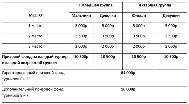Победители турниров E и F награждаются кубками, медалями, дипломами и денежными призами в каждой возрастной группе среди мальчиков и девочек или юношей и девушек. Турниры могут быть объединены, при этом зачет будет раздельный. В зависимости от количества участников в каждой возрастной группе будет разыгран дополнительный призовой фонд.