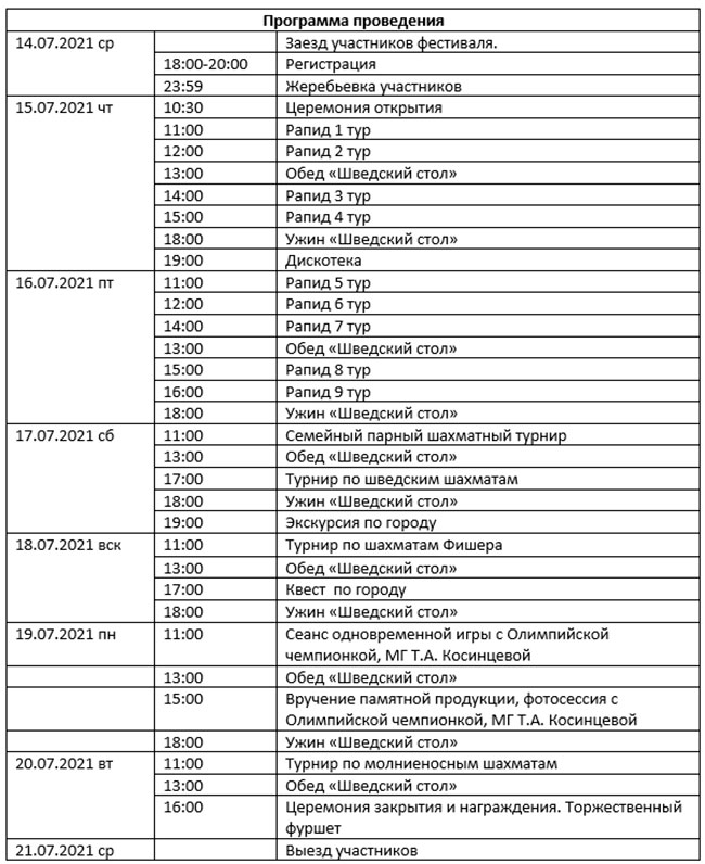 В программу фестиваля также включены: увлекательный квест по городу, экскурсия, мастер-класс, дискотека, подарки, фотосессия с Олимпийской чемпионкой, МГ Т.А. Косинцевой и праздничный вечер в честь Международного дня Шахмат!