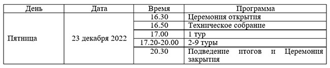 В связи с ограничением количества посадочных мест (120 мест) крайний срок регистрации – 20 декабря 2022 года. Для обеспечения надлежащих турнирных стандартов представители игроков или сами участники должны заполнить официальную регистрационную форму и отправить ее контактному лицу до указанного выше срока регистрации на электронную почту javaminsk@mail.ru.