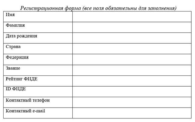 Заявки рассматриваются в порядке подачи. Неполные регистрационные формы не принимаются. Все игроки или официальные лица должны иметь ID FIDE. В случае отсутствия такового, нужно обращаться за получением в свою национальную федерацию шахмат.