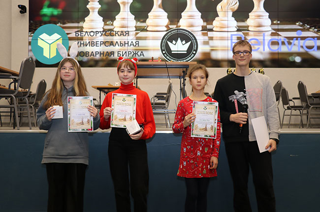 По окончании турнира прошла торжественная церемония награждения "Лучших из лучших" в пяти номинациях. Об этом подробнее завтра, а пока показываем всех призеров открытого рождественского блиц-турнира. Сладкое угощение от ОО "Белорусская федерация шахмат" получили абсолютно все участники соревнований.