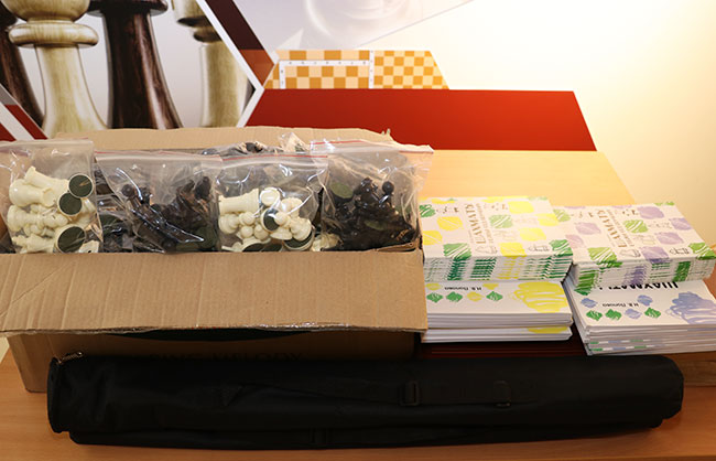 Кроме того ОО "БФШ" в целях укрепления материально-технической базы передало отделу образования, спорта и туризма Наровлянского райсполкома 20 шахматных досок и комплектов шахматных фигур, две демонстрационные доски, а также 20 учебников первого и второго года обучения и 20 шахматных тетрадей.
