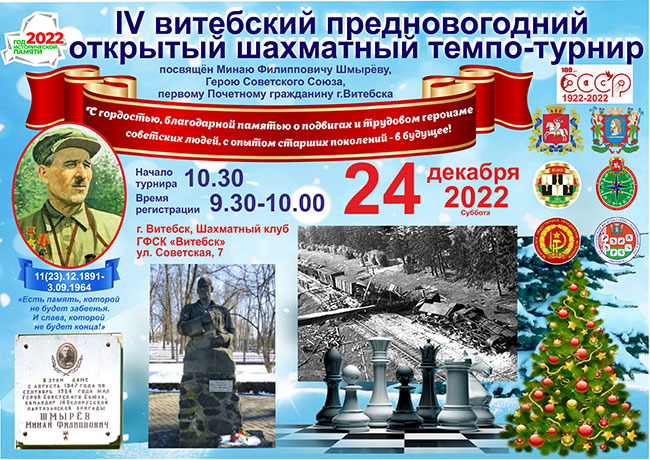 В прошедшую субботу состоялся 93-й Витебский шахматный лично-командный темпо-турнир, посвященный легендарному земляку Минаю Филипповичу Шмырёву, Георгиевскому кавалеру, Герою Советского Союза, обладателю многих орденов и медалей СССР, командиру 1-й Белорусской партизанской бригады, первому почетному гражданину г. Витебска.
