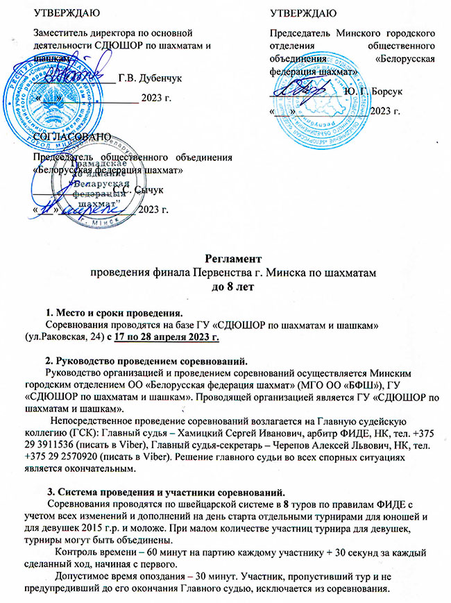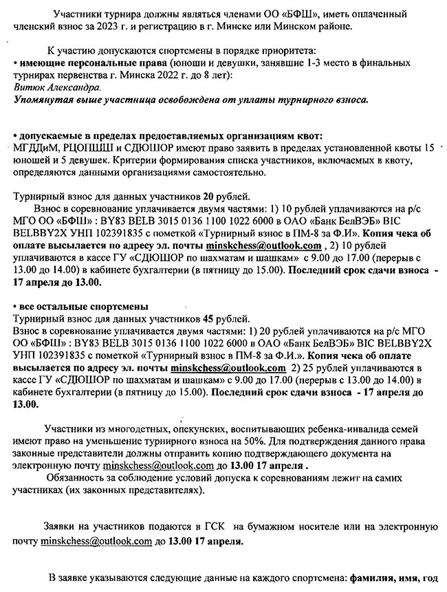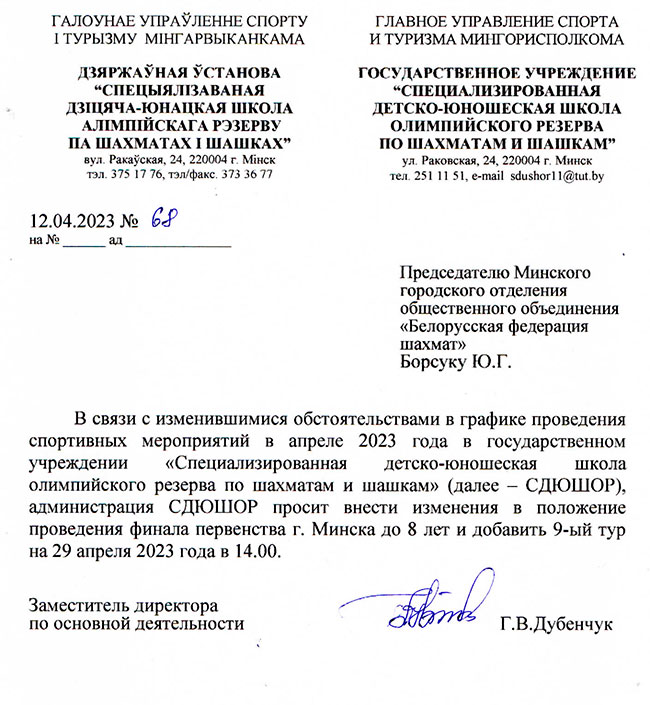 В связи с обращением СДЮШОР о появившейся возможности провести финал г.Минска в 9 туров Минское городское отделение ОО "БФШ" вносит изменение в Положение о проведении данного турнира.
