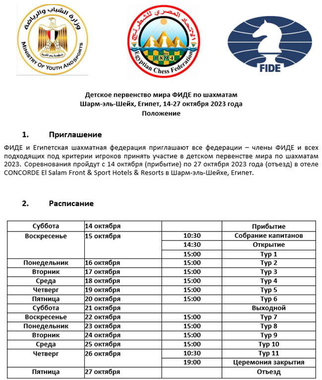 • Для обеспечения надлежащих турнирных стандартов федерации – члены ФИДЕ должны полностью заполнить регистрационную форму, информацию о проживании и прилете (см. на сайте) и отправить ее обратно контактному лицу до дедлайна регистрации 14 августа 2023 года. Неполные регистрации и индивидуальные заявки не принимаются.