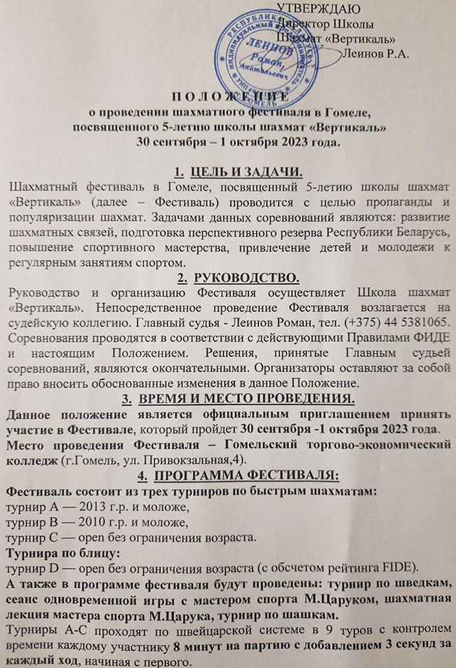 Турнирный взнос должен быть перечислен не позже 25 сентября 2023 года. Банковские реквизиты (для расчетов в белорусских рублях): - ИП Леинов Роман Анатольевич, УНП 491416506 р/с BY76BPSB30133068930119330000 РД 300 по Гомельской области ОАО "Сбер Банк" г.Гомель, ул. Крестьянская 29а, БИК - BPSBBY2X