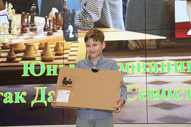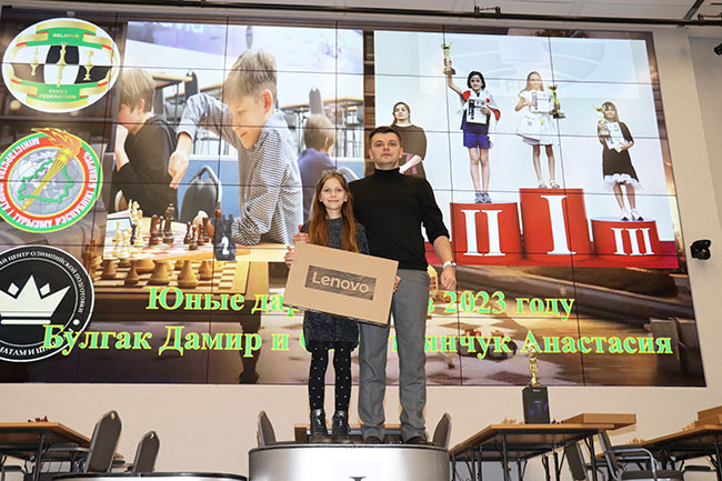 В этом году также решили установить номинации "Юные дарования-2023 года". Анастасия Севостьянчук и Дамир Булгак награждены ноутбуками от ОО "Белорусская федерация шахмат".