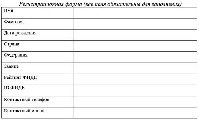 Заявки рассматриваются в порядке подачи. Неполные регистрационные формы не принимаются. Все игроки или официальные лица должны иметь ID FIDE. В случае отсутствия такового, нужно обращаться за получением в свою национальную федерацию шахмат.