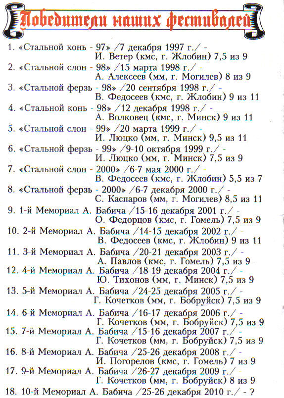 12 лет назад, попав в автомобильную катастрофу, погиб один из сильнейших шахматистов Жлобина, многократный чемпион города по быстрым шахматам. И теперь, дабы почтить память слишком рано ушедшего из жизни любителя шахмат, жители Жлобина ежегодно проводят мемориал его имени.
