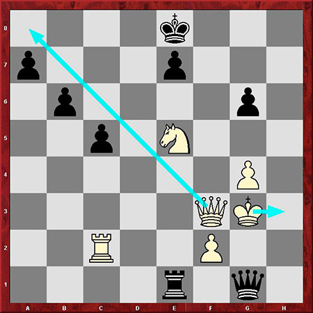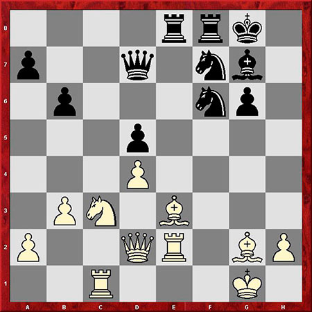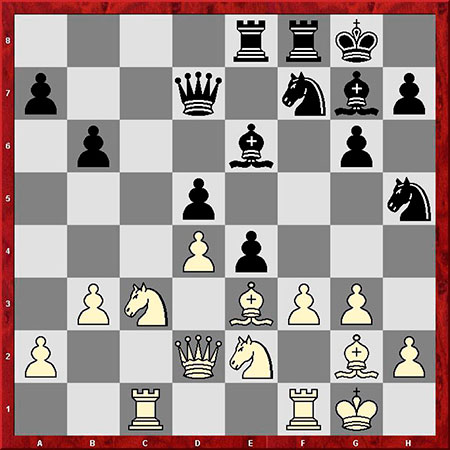 13.hxg6 13...hxg6 14.Rxh8+ Bxh8 15.Qe2 Qxd5! Вроде черные проигрывают коня, но.. 16.Bxa5 Qxa2 Белые не могут сохранить лишнюю фигуру. 17.Qb5+ Bd7 18.Bc4! Qa3 19.Bxf7+ Kxf7 20.Qc4+ Kf8 21.Bd2 Qa6 22.Bh6+ Bg7 23.Qc3 Qe6+ 24.Kf1 Bxh6 25.Qh8+ Qg8 26.Qxh6+ Qg7 27.Qe3 b6 Серия единственных ходов привела к позиции динамического равновесия, где у черных две лишние пешки, но очень слабый король. 28.Ne5? Неточность, пока рано определять позицию коня, срочно надо было усилить давление ходом 28.Re1!, и после примерного 28..Rd8 29.Qd3 Qf6 30.Ne5 Ke8 31.Qa6 Bf5 32.Qxa7 Bxc2 33.Kg1 Bb3 34.Nxg6 Rd1 35.Qa8+ Kf7 36.Ne5+ Kg7 позиция равна, так как нельзя 36...Qxe5? 37.Qf3+ Ke8 38.Qxd1!! 28...Rd8 29.Kg1? Точнее 29.Re1 29...Bf5 30.Ra1 Qh8?! 31.g4! Пару неточностей черных, и белые форсированно выигрывают слона. Но все не так просто.. 31..Bxc2 32.Rc1 Ke8 33.Rxc2 Rd1+ 34.Kg2 Qh1+ 35.Kg3 Re1? Уже стоило форсировать ничью вечным шахом 35...Qg1+ 36.Kf3 Qh1+ 37.Kg3 (или 37.Kf4 g5+ 38.Kxg5 Rd6 39.Ng6 Qd5+ 40.Kh6 Rxg6+ 41.Kxg6 Qf7+ 42.Kg5 Qf6+ 43.Kh5 Qf7+) 37...Qg1+ 36.Qf3? У белых появлялся шанс сохранить фигуру и избежать вечного шаха путем 36.Re2! Rg1+ 37.Kf4 Qh2+ 38.Ke4 Qh1+ 39.Qf3 Qxf3+ 40.Kxf3 с технически выигранной позицией 36...Qg1+