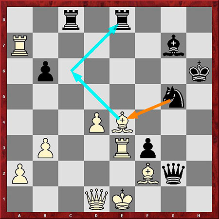 В партии еще последовало 31...Kxg7 32.Bf4 Nc5! Еще интереснее было 32...Nf2!! с примерным вариантом 33.Qg3 Rxe2 34.Bf1 Rxf4 35.Nxf4 Nh3+ 36.Bxh3 Nf3+ 37.Kf1 Nxh2+ 38.Qxh2 Qf3+, но и тут черные легко выигрывают. 33.Qg3 Qxe2 34.dxc5 Qd1+ 35.Bf1 Qxd5 36.Bd6 Qd4+ 0–1