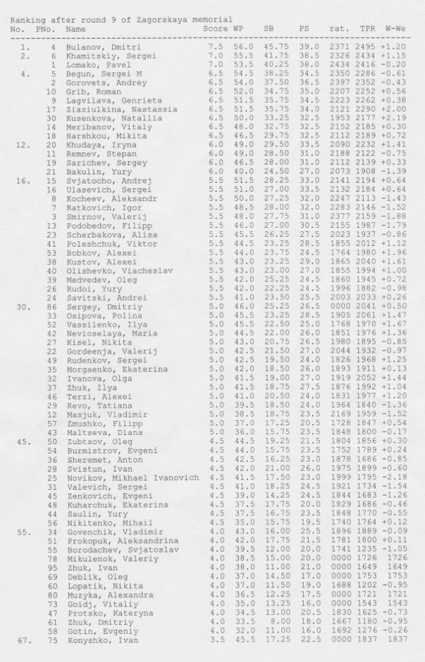 Сегодня завершился турнир памяти Татьяны Загорской. Победителем мемориала стал Дмитрий Буланов. Вторую строчку в турнирной таблице занял Сергей Хамицкий, опередив по коэффициенту Павла Ломако. В турнире кроме основных, было установлено много специальных юношеских призов. И награды нашли своих победителей!