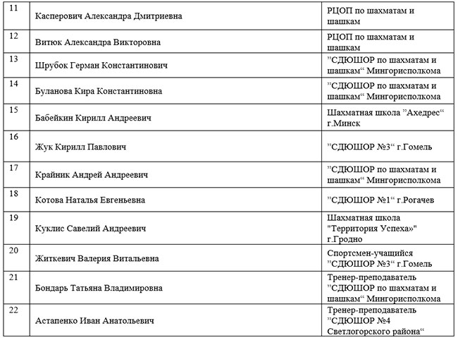 Отдельного внимания заслуживает результат Дамира Булгака, игравшего весь турнир на первых досках и явно зарекомендовавшего себя одним из лидеров своей возрастной категории (юноши до 12 - самая многочисленная и плотная по результатам). В итоге юный белорусский шахматист в дележе 2-6 места по дополнительным показателям стал пятым в рапиде, в дележе 2-5 места он вновь пятый, но уже в блице! (Тренеры: Симеон Эдуардович Мерибанов и Елена Евгеньевна Заяц).