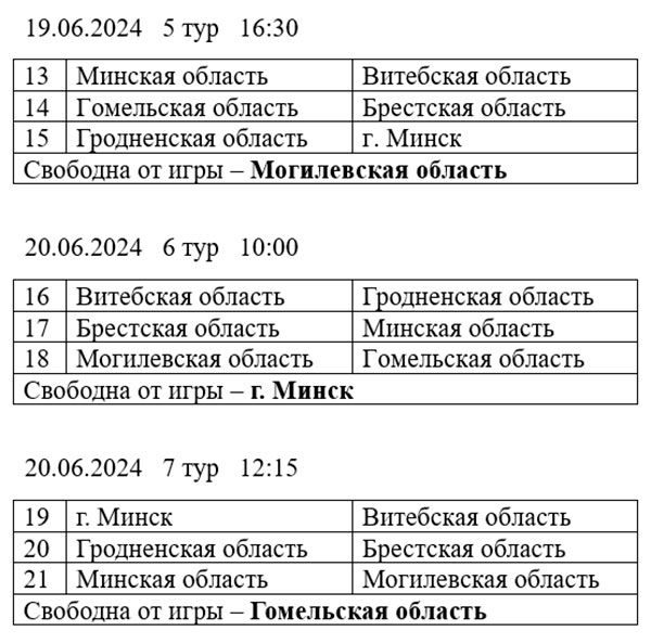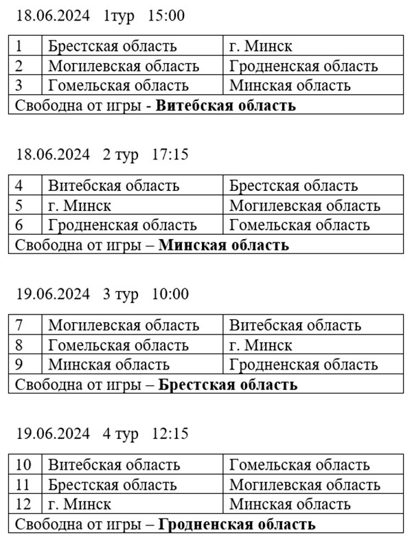 Соревнования проводятся с 18 по 20 июня 2024 года на базе УО «Гродненский государственный областной Дворец творчества детей и молодежи» (Коложский парк, 1), по круговой системе в 7 туров при участии 7 команд. Состав команды: 6 спортсменов (не менее 2 девушек) 2009 г.р. и моложе и 1 тренер-представитель.