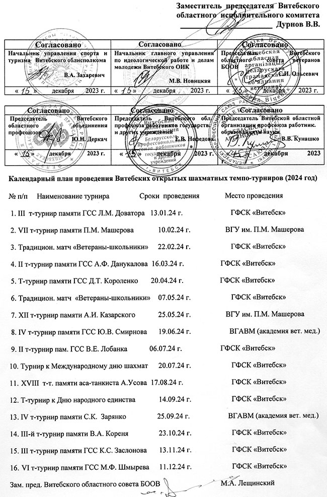 Календарный план проведения шахматных турниров на 2024 год утвержден 15.12.2023 г. управлением спорта и туризма, Главным управлением идеологической работы и по делам молодежи Витебского облисполкома, президиумом Витебского областного совета ветеранов БООВ, областным объединением профсоюзов и областными отраслевыми профсоюзами. Турнир с участием 70 шахматистов проводится в рамках плана по взаимодействию в вопросах международного сотрудничества между общественными ветеранскими организациями Витебской области (Республика Беларусь) с регионами Российской Федерации.