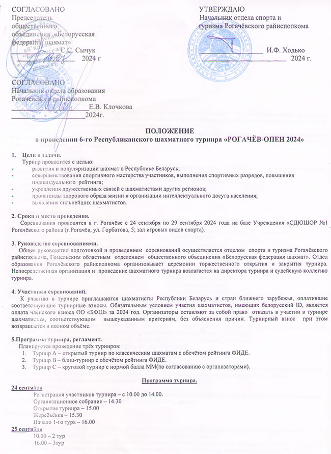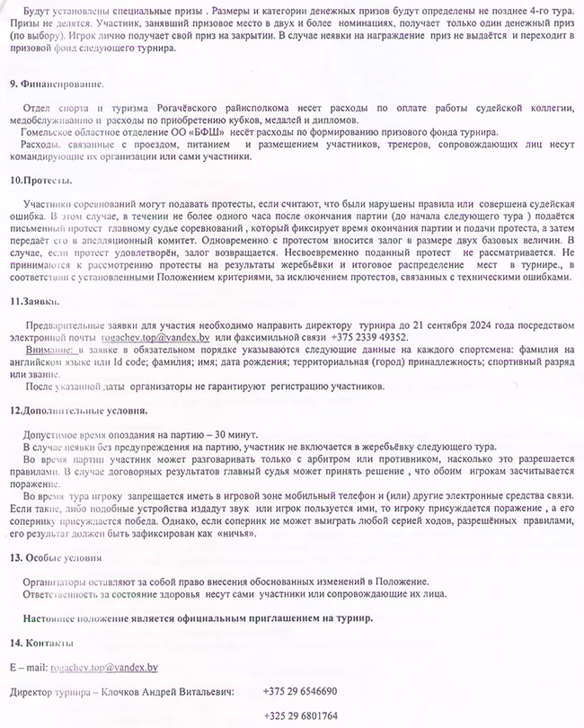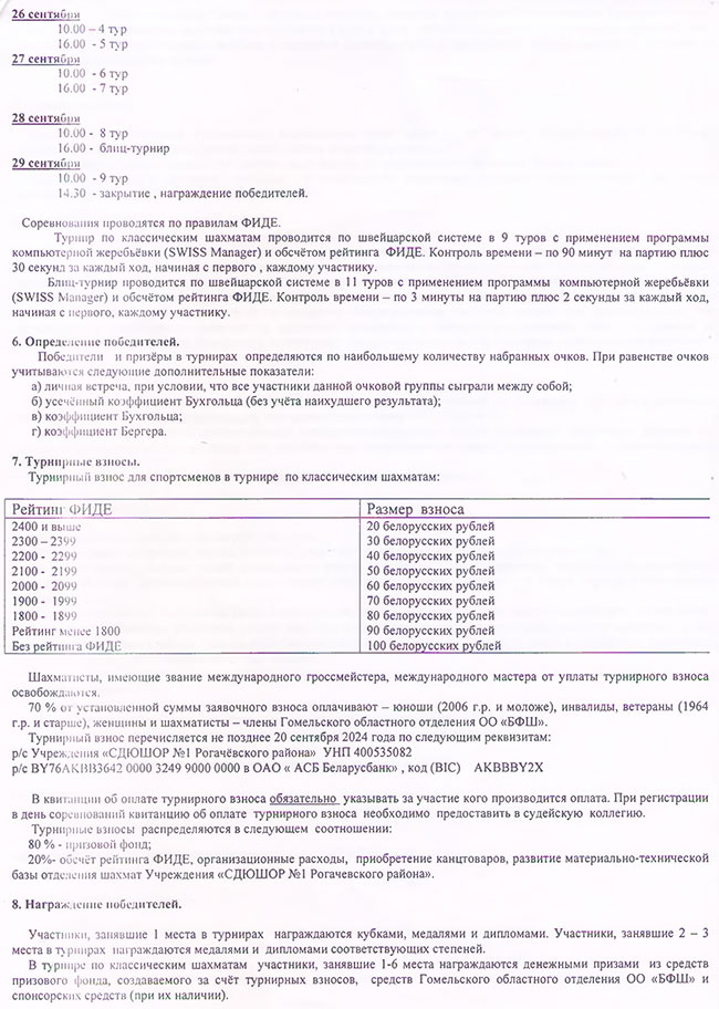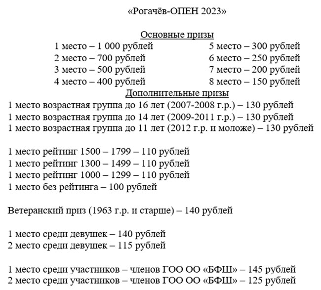 Организаторы VI Республиканского шахматного турнира «Рогачёв-ОПЕН 2024» сообщают, что гарантированная сумма минимального денежного приза за I-е место в опен-турнире составляет 1 000 (одна тысяча) рублей. Кроме того, напоминаем таблицу призов турнира прошлого года. Если будет более 60 участников в этом году – то призы будут не меньше.