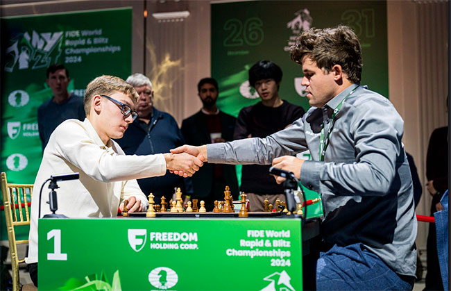 ФИДЕ отстранила 34-летнего норвежца от турнира из-за несоблюдения дресс-кода. Карлсен пришел на матч в джинсах и после штрафа главный судья турнира Алекс Головчак исключил действующего чемпиона мира по рапиду. Карлсен также снялся с чемпионата мира по блицу.