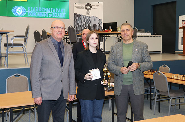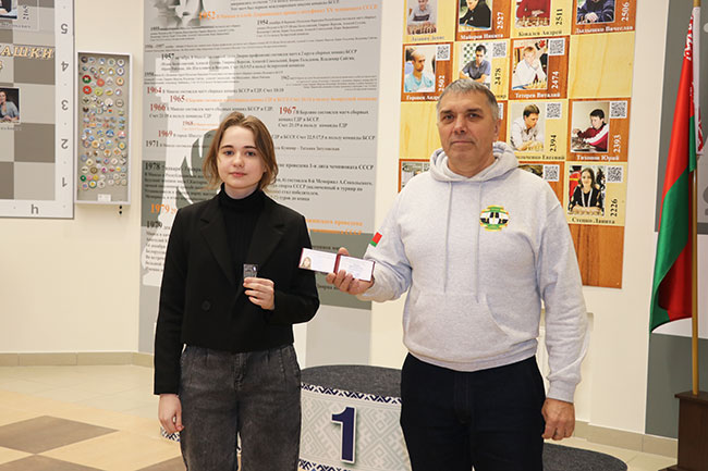 На торжественной церемонии закрытия соревнований председатель ОО "БФШ" Сергей Сычук вручил удостоверения мастера спорта Республики Беларусь по шахматам Ксении Норман...