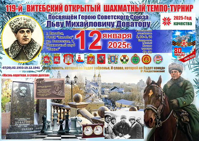 В рамках совместных мероприятий года Великой Победы в канун Старого-Нового года на базе ГФСК "Витебск" 12 января прошел 119 Витебский открытый шахматный темпо-турнир памяти Героя Советского Союза Л.М Доватора.