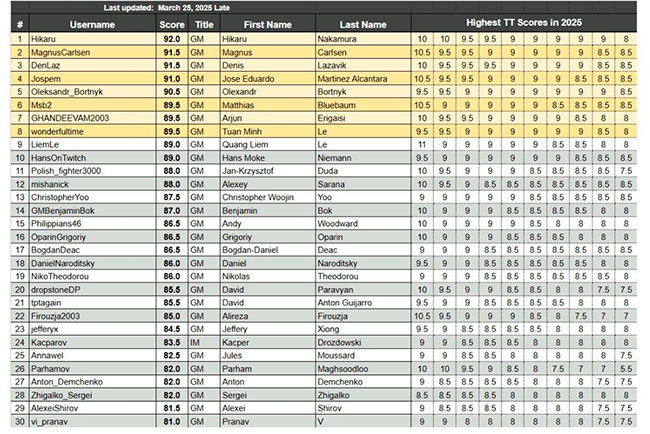 Напомним, что Гран-при «Титульный вторник» проходит с 7 января по 27 мая 2025 года. Восемь лучших игроков (определяются по сумме 10 своих лучших очковых результатов) получают право на участие в главном событии чемпионата по скоростным шахматам. Сумма 10 лучших очковых результатов каждого игрока учитывается в таблице лидеров Гран-при «Титульный вторник».