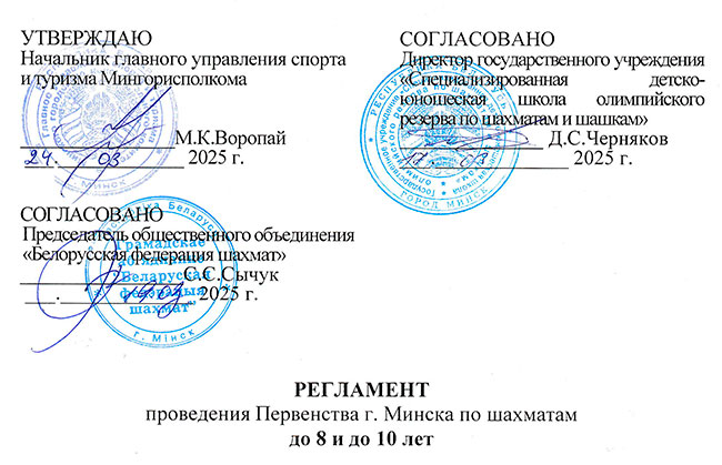 и туризма Республики Беларусь от 31.08.2018 № 60, иными актами законодательства Республики Беларусь и определяет порядок проведения первенства г. Минска по шахматам в возрасте до 8 и до 10 лет (далее – соревнования).