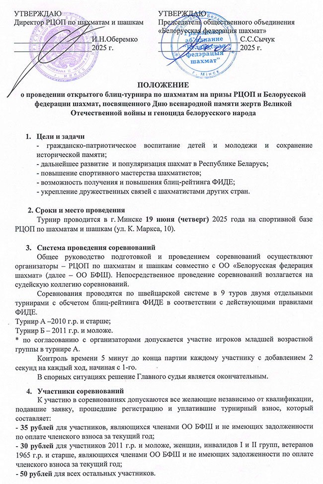 Для обладателей званий GM, WGM, IM, WIM участие без взноса (для белорусских игроков при условии отсутствия задолженности по оплате членского взноса за текущий год в ОО БФШ).