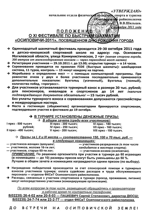«Осиповичи 2011». XI фестиваль по быстрым шахматам, посвященный дню города.