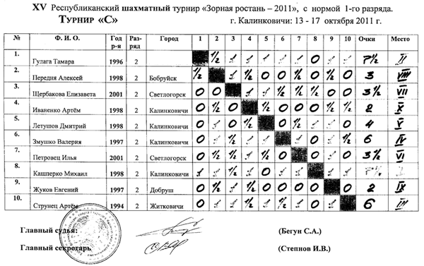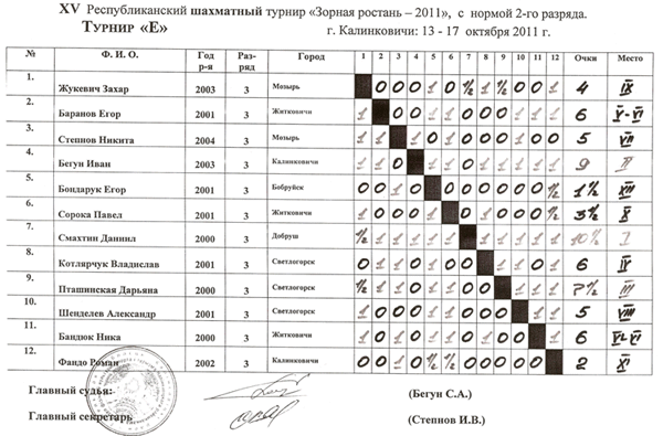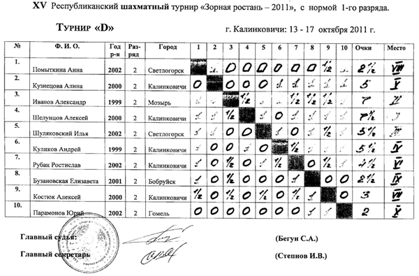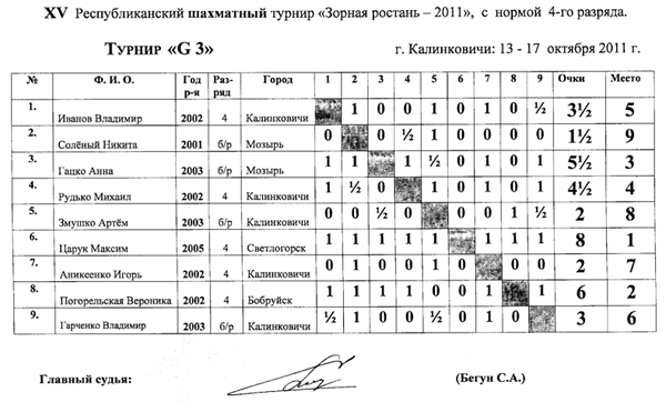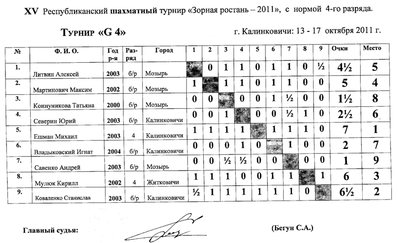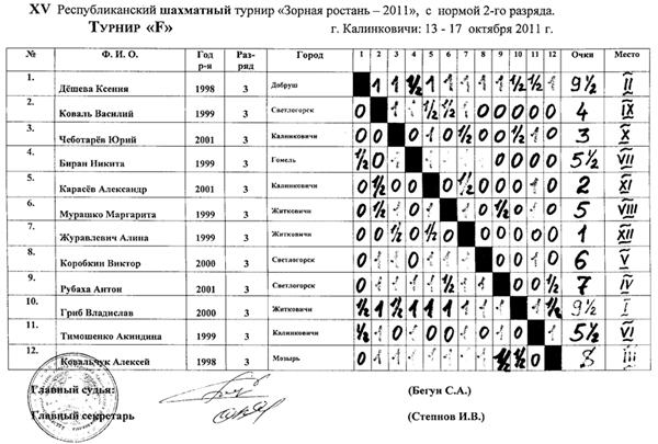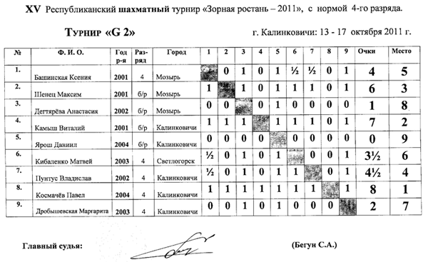 Здесь упорная борьба развернулась за первое и второе место, по дополнительным показателям 1 место досталось Грибу Вячеславу из Житкович, 2 место Дёшевой Ксении из Добруша — они набрали по 9,5 очков из 11 и получили 2 разряд. 3 место у Ковальчука Алексея (г. Мозырь) набравшего 8 очков.