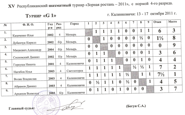 Выиграл калинковчанин Шелунцов Алексей набравший 7,5 очков, 2 место у Иванова Александра (г. Мозырь) набравшего 7 очков — получили 1 разряд, 3 место у Шуляковского Ильи (г. Светлогорск) который по дополнительным показателям обошёл Куликова Андрея из Калинкович.