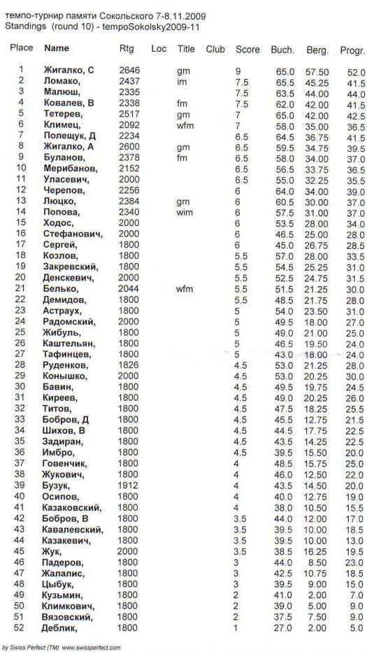 С 6 по 8 ноября в РЦОП г.Минска проходит второй фестиваль шахмат памяти выдающегося шахматного теоретика и тренера А. П. Сокольского. В программу фестиваля входит блиц-турнир (6 ноября) и турнир по быстрым шахматам (7-8 ноября).Сегодня завершилась вторая часть фестиваля — турнир по быстрым шахматам. Участие в турнире приняли 52 шахматиста, среди которых 6 гроссмейстеров, 2 международных матсера, 4 мастера ФИДЕ и большое количество кандидатов в мастера спорта. Борьба была нешуточной и к финишу участники пришли в следующем порядке: