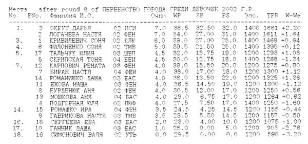 У девочек турнир оказался более напряжённым и первое место определилось по коэффициенту Бухгольца. Первой стала Окрут Дарья, второе место у Логачёвой Анастасии (у них по 7 очков). Третья — Кривилевич Софьи с 6 очками.