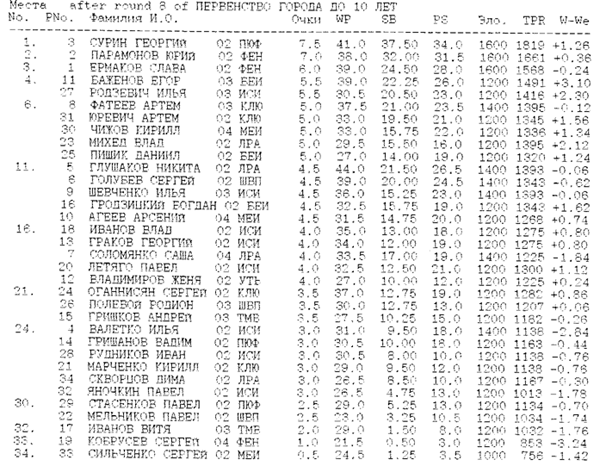 В турнире мальчиков до 10 лет уверенную победу с 7,5 очками одержал Сурин Георгий. Второе место с 7 очками занял Парамонов Юрий, третье — Ермаков Слава (6 очков).