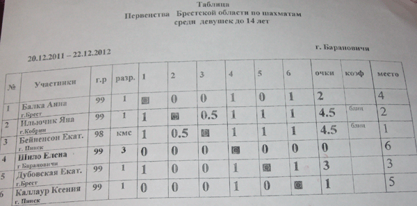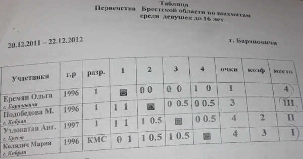 В турнире играло лишь 4(?) человека, то есть в любом случае все участницы сразу попадали на республиканские соревнования. В первый же день стало ясно, что борьба будет вестись за 1-2 и 3-4 места. Так и получилось. 1.Колядич М. (Кобрин), 2.УзловатаяА. (Брест),3. Подобедова М. (Кобрин). К сожалению, опытнейшие шахматисты порой демонстрировали "чудеса". Ну да ладно, надеемся, что девушки проанализируют свои "неточности" и порадуют нас всех отличными партиями.