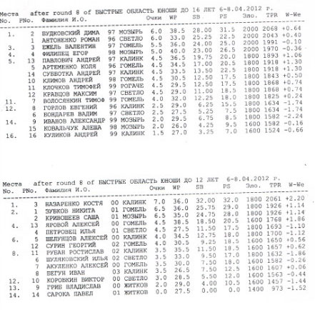 У юношей до 12 лет в отсутствии лидеров Пашковского Льва (который участвовал в турнире в Фридек-Мистеке, где занял 1 место), Калиновского Сергея и Иванникова Максима которые уже имеют путёвки на республиканский турнир, места распределились следующим образом: